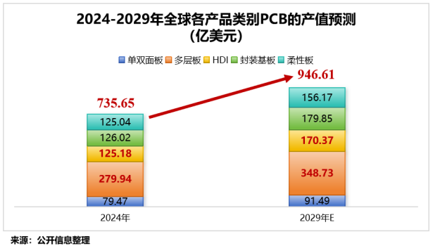 数据显示,2024年全球PCB产值为735.65亿美元,预计2029年全球PCB市场规模预计将达到946.61亿美元,年均复合增长率为5.2%。