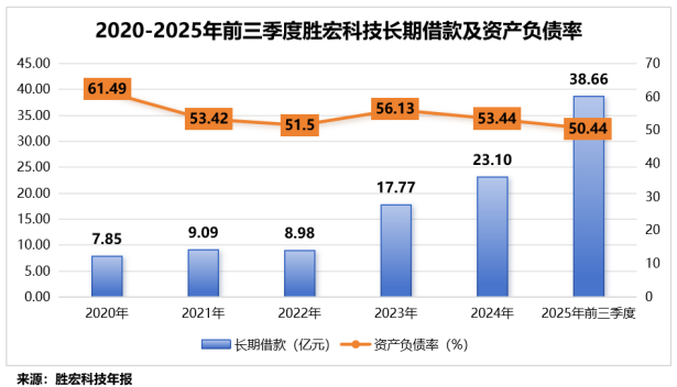 2020-2025年前三季度,胜宏科技的长期负债由7.85亿元攀升至38.66亿元,资产负债率也长期在50%以上的水平。