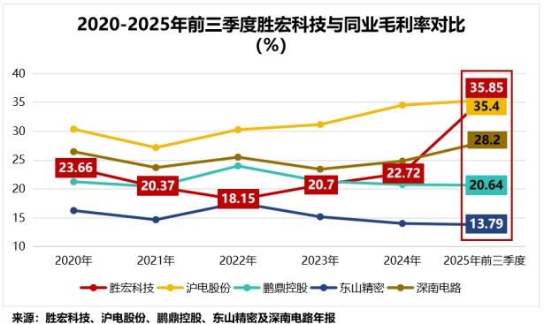 2025年前三季度,公司毛利率从2020年的23.66%提升到35.85%,显著高于沪电股份(35.4%)、鹏鼎控股(20.64%)、东山精密(13.79%)及深南电路(28.2%)等同行。
