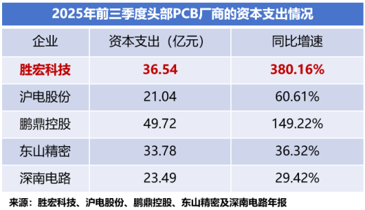 2025年前三季度,在头部PCB厂商中,胜宏科技的资本支出达到36.54亿元,同比激增380.16%,增速位列第一。