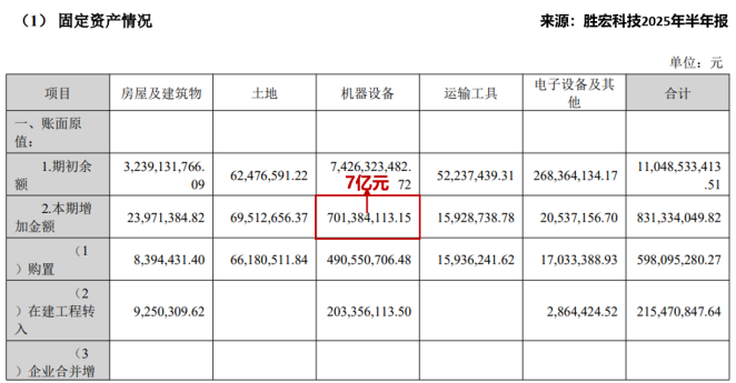 2025年上半年,胜宏科技固定资产高达74.87亿,同比增长8.65%;其中,仅“机器设备”本期增加额就达7亿元,占新增固定资产的84%。