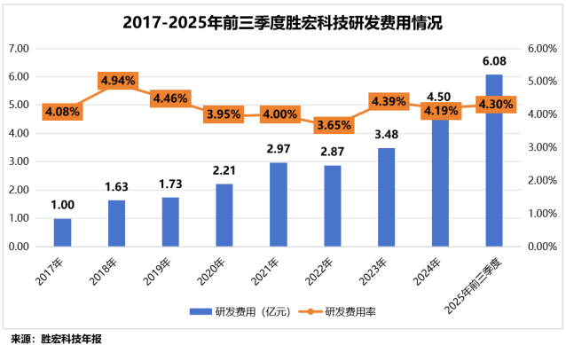 2017-2025年前三季度,公司研发费用逐年增长,累计投入26.5亿元,研发费用率几乎都维持在4%以上。