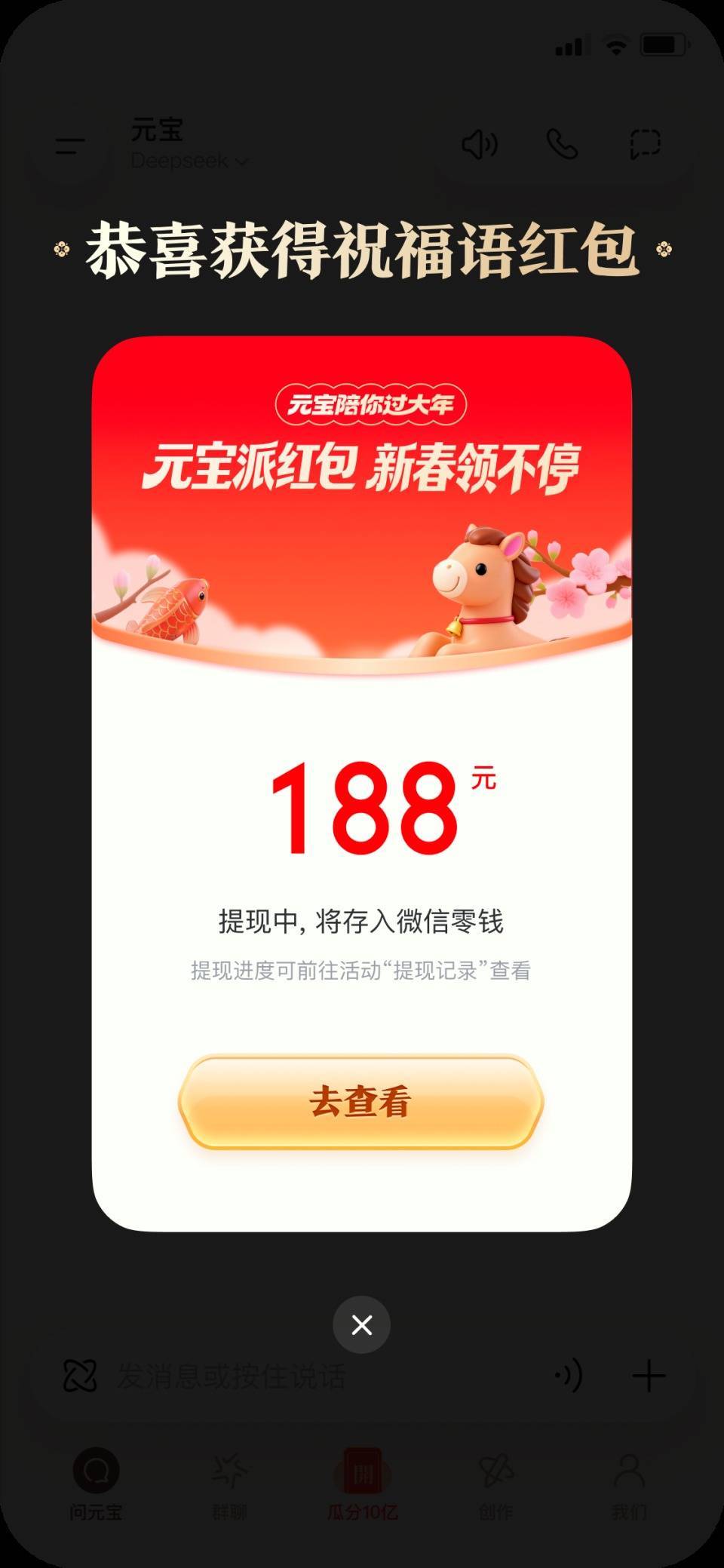 主会场之外,元宝特别设置了“祝福语红包”。活动期间每天会通过不同渠道不定期下发红包祝福语,用户获得祝福语后打开元宝App,在「问元宝」对话框输入指定祝福语并发送,就有机会触发祝福语红包,凭手气还能抢到188元、888元大额红包。