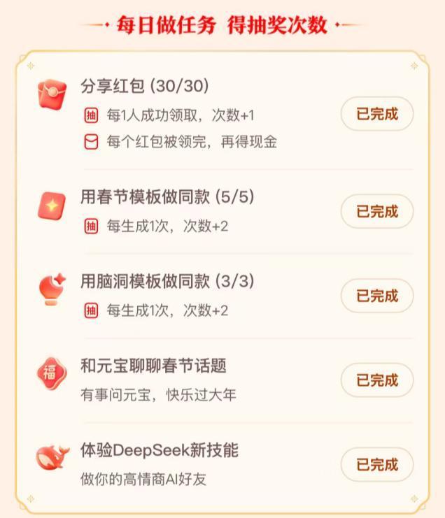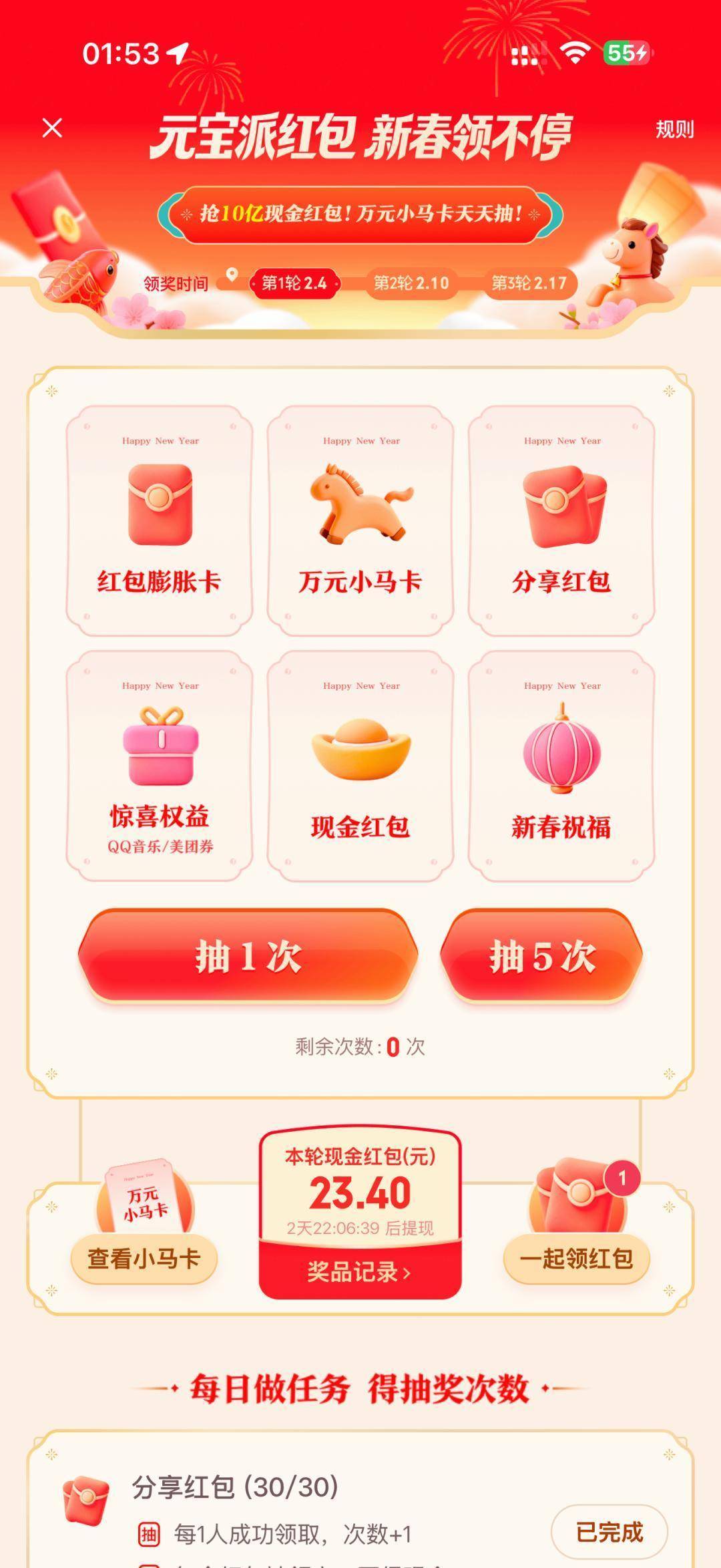 1月25日,腾讯官方发布《关于春节分10亿现金的通知》:在2月1日上线春节活动,用户上元宝App分10亿元现金红包,单个红包金额可达万元。用户将元宝App更新到2.55.0版本以上,进入首页点击底部「抢10亿」,即可进入新春活动主会场。活动从2月1日持续到2月17日,包含“主会场抽红包”和“祝福语红包”两大核心玩法。不少网友已经去试玩了,来看看有哪些玩法↓↓↓在主会场,用户每天都可获得5次抽奖机会,通过做任务,每天还可以额外获得40+次抽奖机会,有机会抽到现金红包、万元现金小马卡、红包膨胀卡、分享红包、惊喜权益、新春祝福等不同类型红包。