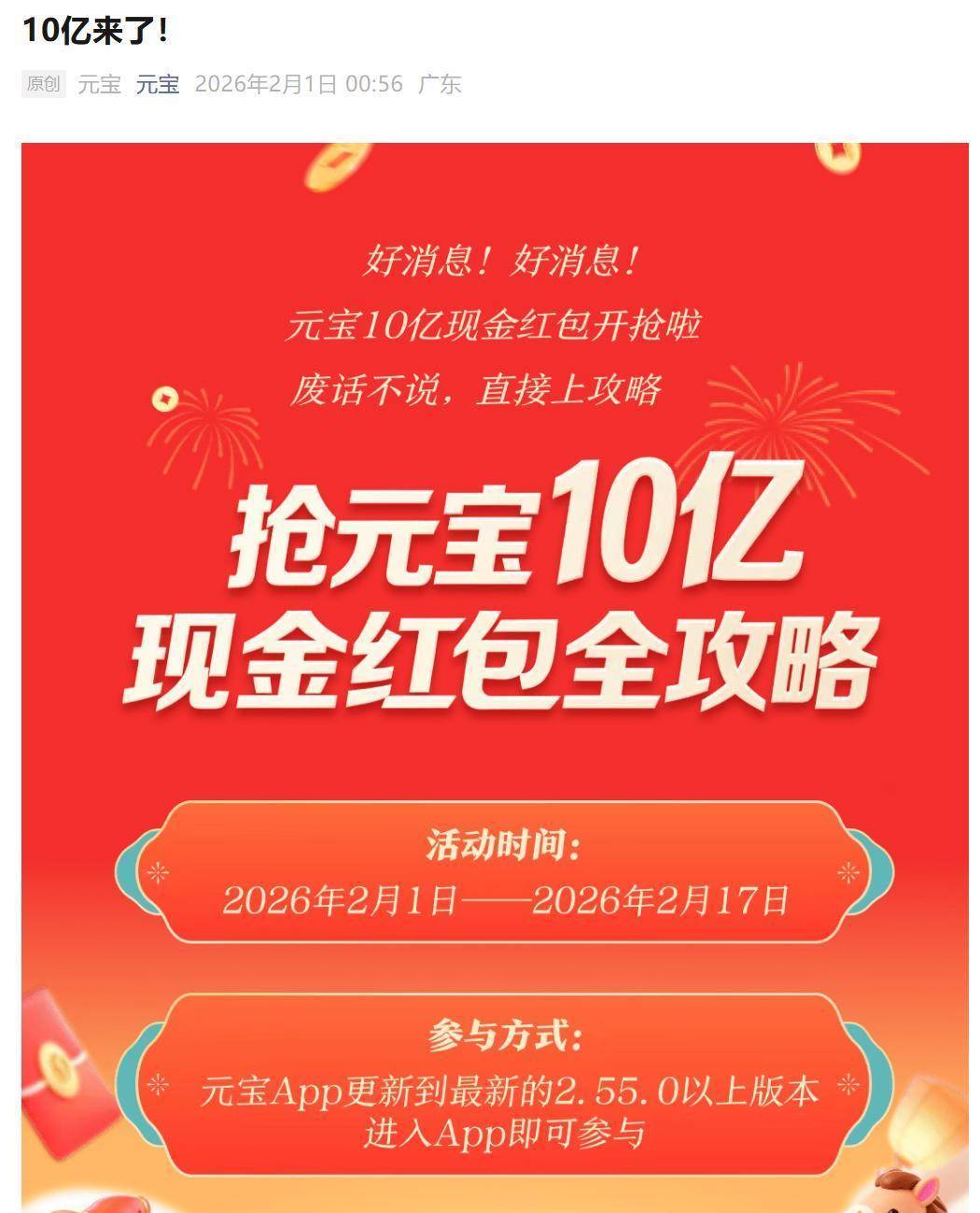 2月1日凌晨元宝微信公众号发文称10亿现金红包开抢