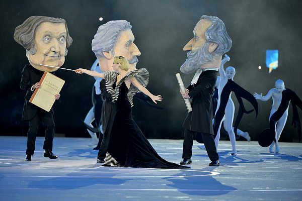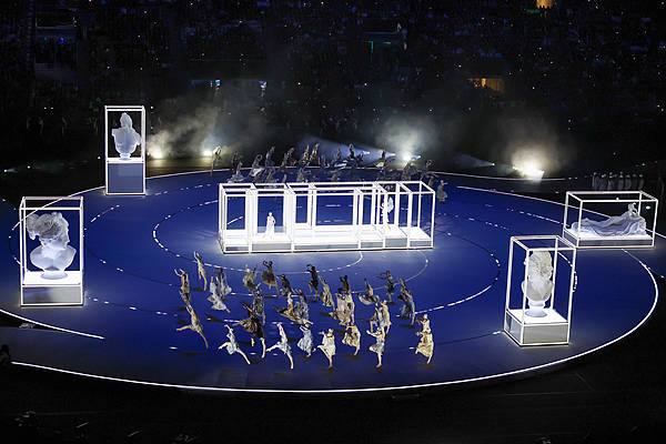 开幕式核心环节在圣西罗球场内展开,由擅长执导大型演出的马尔科·巴利奇担任总导演。既有意式精致简约、雅致格调,又带着意大利独有的极致华丽与张扬。色彩是核心叙事线索:开篇以白色为主调,用芭蕾演绎安东尼奥·卡诺瓦的雕塑《拯救普赛克的厄洛斯》;随后切换为黑白格调,致敬费里尼的《甜蜜的生活》与片中的狗仔文化;最终步入绚烂篇章,巨型悬浮颜料管向舞台倾泻彩色绸带,场面缤纷夺目。